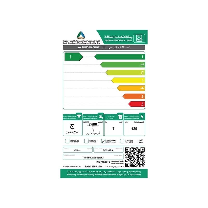 غسالة توشيبا تعبئة امامية 7 كجم انفيرتر – ابيض